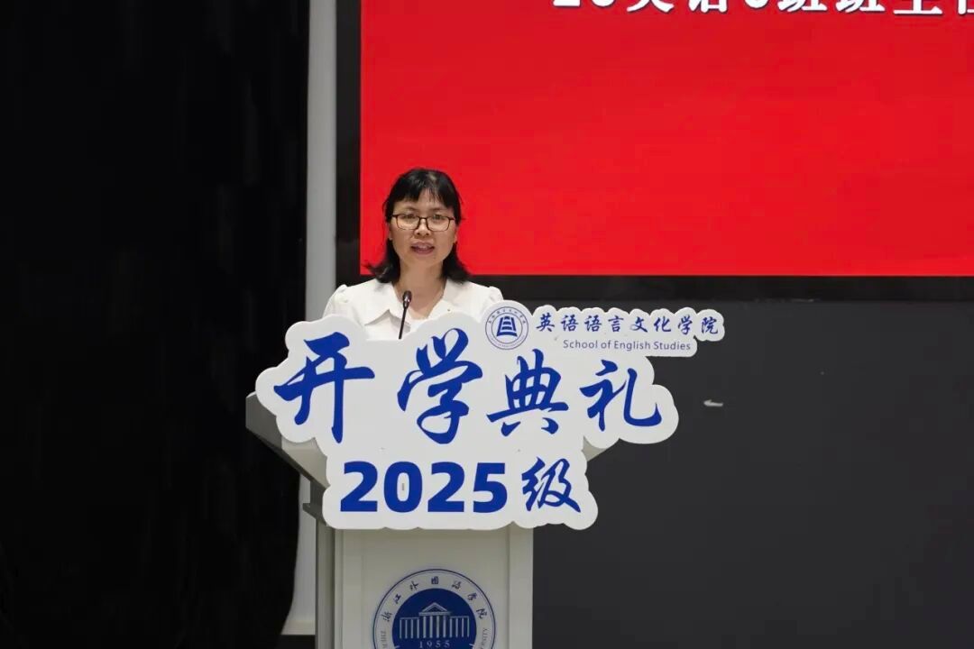 25翻译1班、2班班主任李乐作为教师代表发言,她以“有用”与“有趣”为关键词,寄语新生在未来的学习生活中不断打磨自身:既要成为“有能力、有担当”的语言人才,也要修炼一颗“有感知力、有洞见”的有趣灵魂。她鼓励同学们以丰厚的人文阅读为路径,从文学的表达魅力、哲学的思维训练、思想史的多元视角,到艺术所激发的感知力,不断拓展语言的触角,锤炼思维的深度。