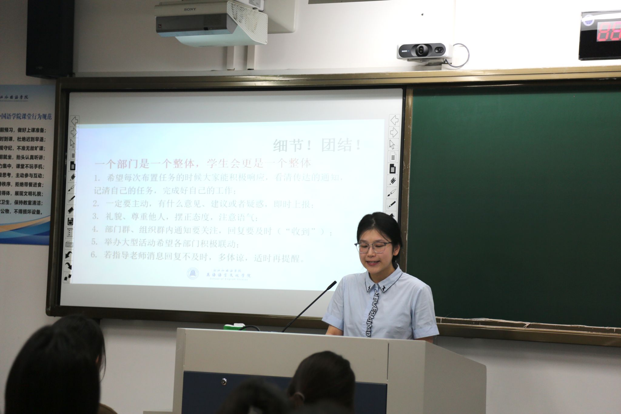 为帮助新成员迅速熟悉工作,本次大会设置了详实的工作培训环节。王佳楼就部门活动文档规范撰写命名、妥善存档保管,推文、报账、物资管理以及各项活动的注意事项做了清晰的说明。会场内,新干事们笔尖沙沙,详实记录。这不仅是一次视野的开拓,更是一次经验的沉淀,为即将开展的工作打下坚实的基础。