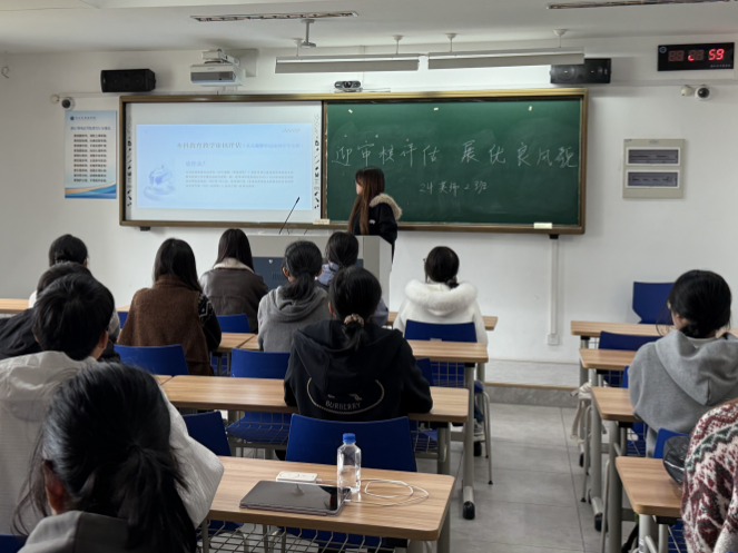各班由班主任、年级辅导员牵头,班长作为主讲人,结合班级实际,带领员工深入学习《审核评估应知应会手册》及主题班会PPT,确保同学们对评估知识听得懂、记得住、说得清。现场还共同学习课堂行为规范与校园文明礼仪准则,对标自身进行查漏补缺,集体研讨改进方案与长效举措。让每一位同学明晰大家都是评估的参与者和受益者,应以高度的“主人翁”意识,积极投入到迎评工作中来。