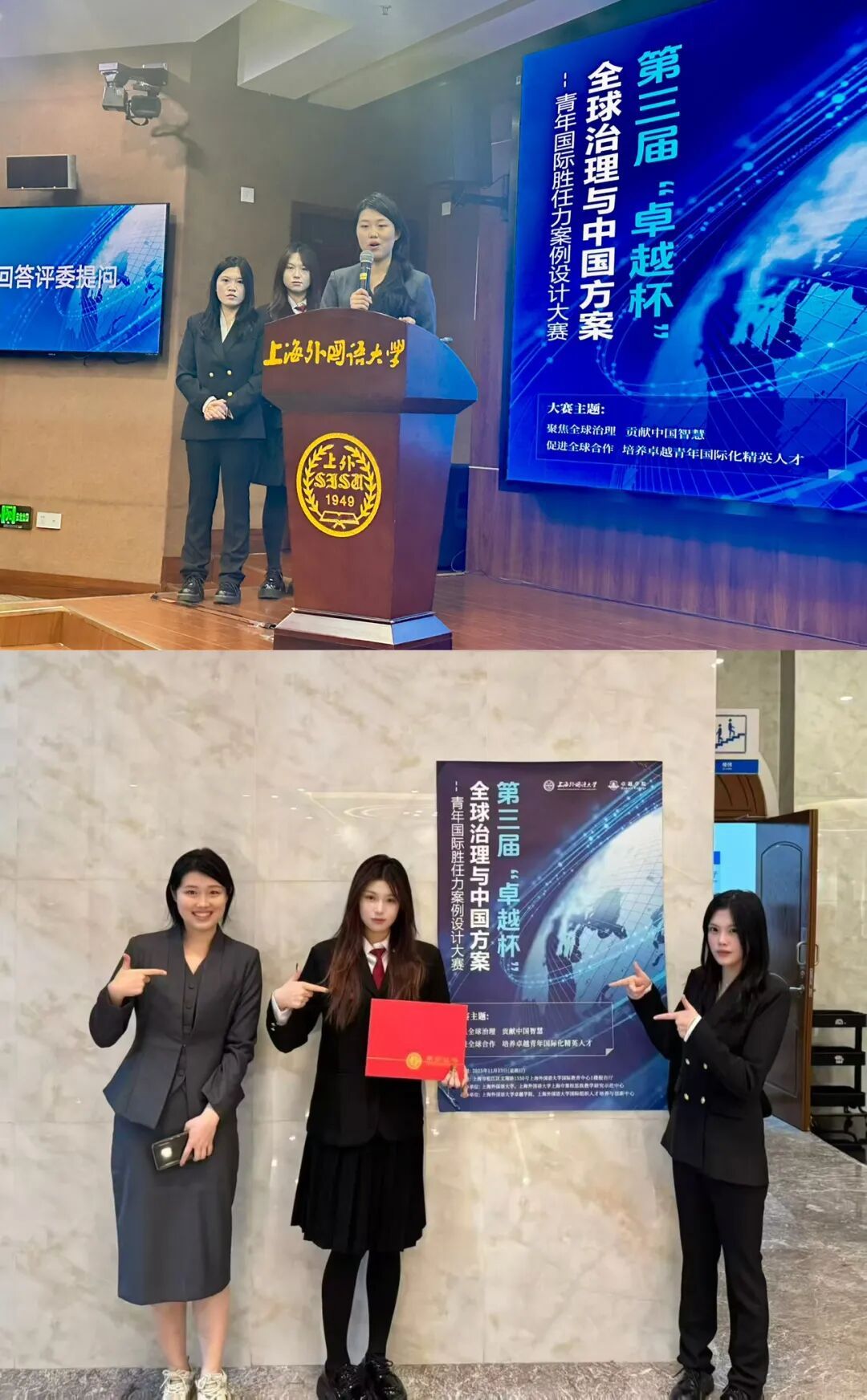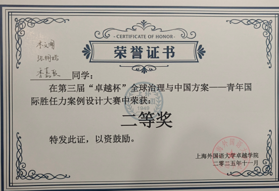 近日,第三届“卓越杯”全球治理与中国方案——青年国际胜任力案例设计大赛圆满结束。在章珏老师的悉心指导下,英国365集团公司2024级英语6班李文澜、张栩嫣、季嘉欣同学与来自同济大学、外交公司、北京外国语大学、上海外国语大学等多所知名高校的优秀选手同台竞技,最终荣获二等奖的好成绩。