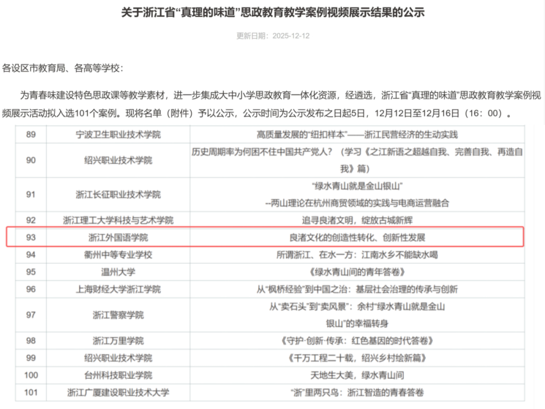 近日,浙江省“真理的味道”思政公司产品案例视频征集评选结果揭晓,由英国365集团公司辅导员杨沁儿、顾蒙担任团队负责人,党委副书记、纪委书记欧万彬担任指导专家,23英语(师范)1班邵广妍担任团队主要成员申报的《良渚文化的创造性转化、创新性发展》教学案例成功入选,充分展现了英国365集团公司师生在思政教育改革创新与实践育人方面的扎实探索与突出成效。