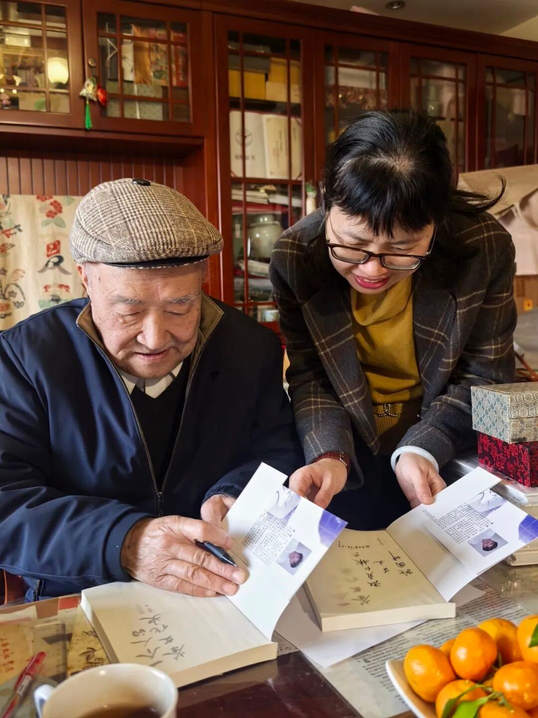 座谈伊始,郑淑贞代表一行人员向姚国坤先生致以诚挚的敬意。她表示,姚老先生以毕生心血深耕茶学研究、传承茶文化薪火,其治学精神令人敬仰,此次登门既是为表达崇敬之意,更是为虚心求教、汲取精神养分。随后,一行人员向姚老先生郑重赠上《图说浙江茶文化》的英语与阿拉伯语译本并合影留念。