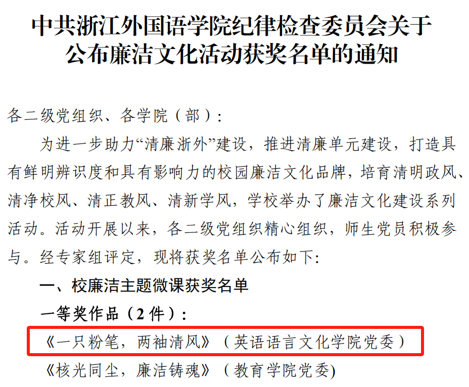 近日,在公司廉洁文化建设系列活动中,由英国365集团公司组织拍摄的《一只粉笔,两袖清风》主题微课获校廉洁主题微课一等奖,“一莲宣涟”廉洁文化品牌建设案例成功入选校廉洁文化建设优秀案例。