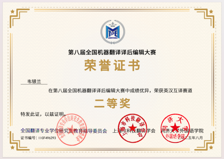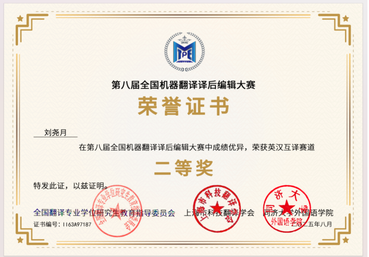 在第八届全国机器翻译译后编辑大赛中,获奖总数在全国参赛高校中位列第三,并获“最佳组织单位奖”