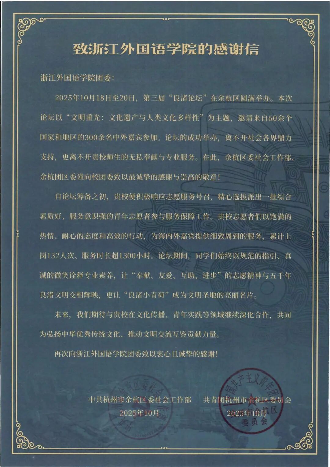 中共杭州市余杭区委社会工作部、共青团杭州市余杭区委员会感谢信