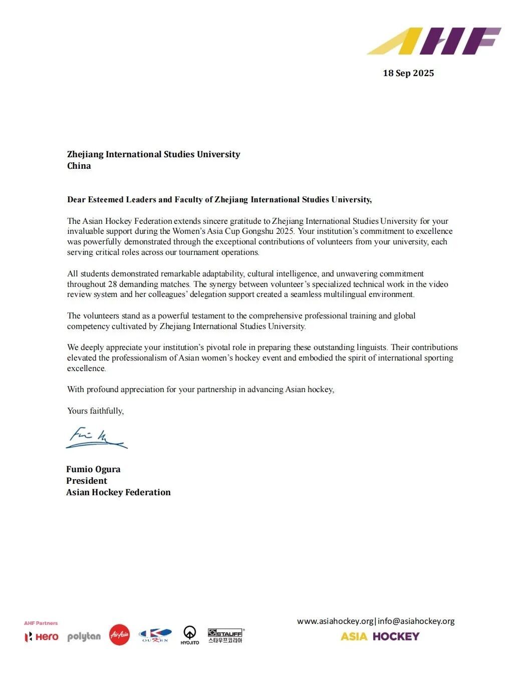 2025拱墅女子曲棍球亚洲杯赛感谢信