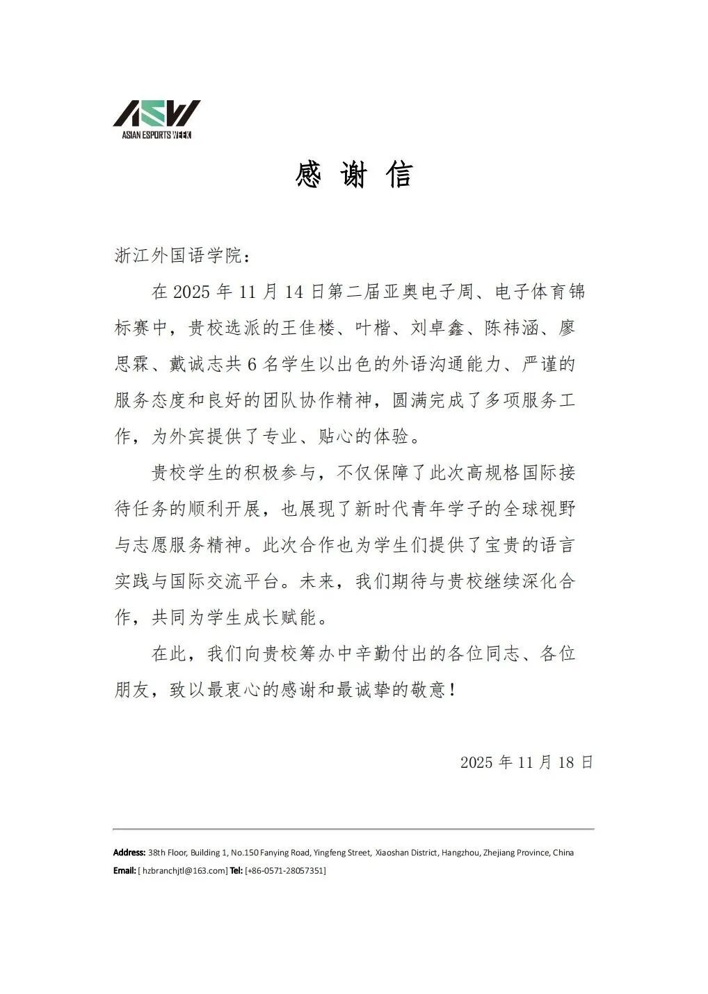 第二届亚奥电子周、电子体育锦标赛感谢信