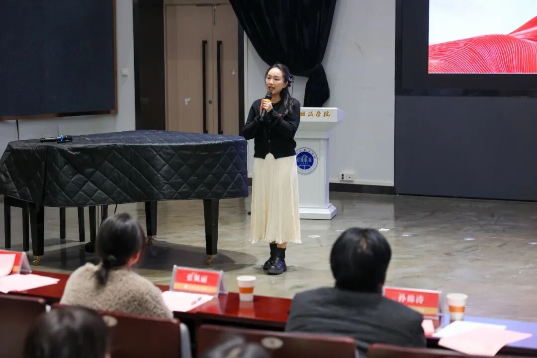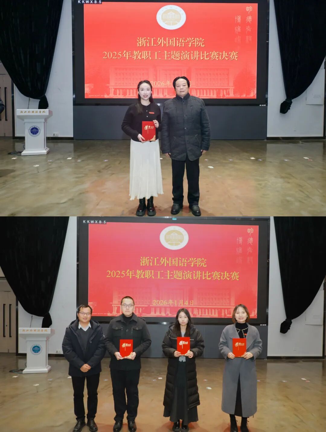 洪妤婷老师以《教育的初心在传承中绽放光芒》为题,结合校庆征文集中三位教育者的故事,从“实干笃行、匠心传承、勇挑重担”三个维度,诠释了教育者的坚守与担当,并号召新一代浙外人在榜样引领下接续奋斗。其演讲情感真挚,荣获一等奖。