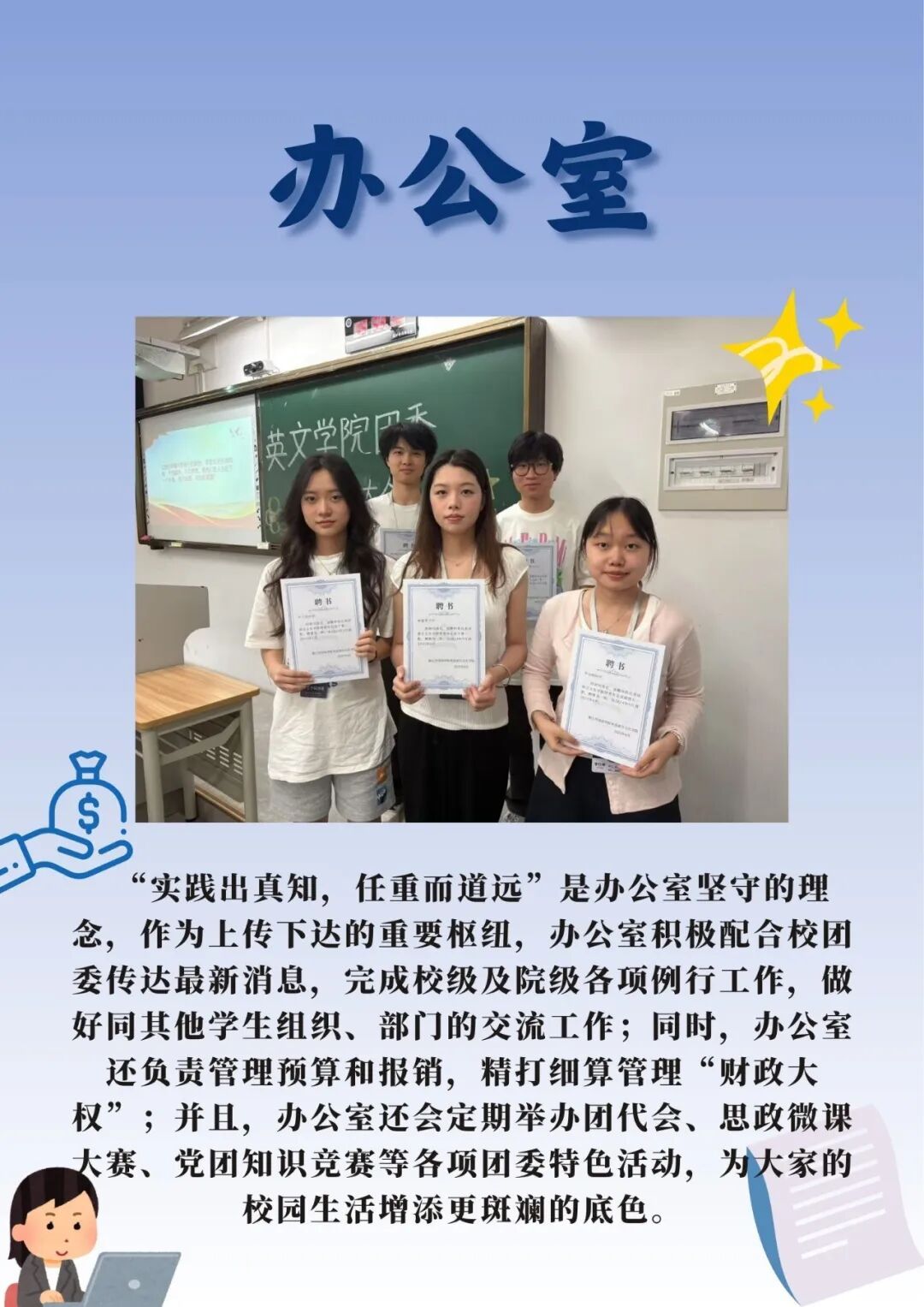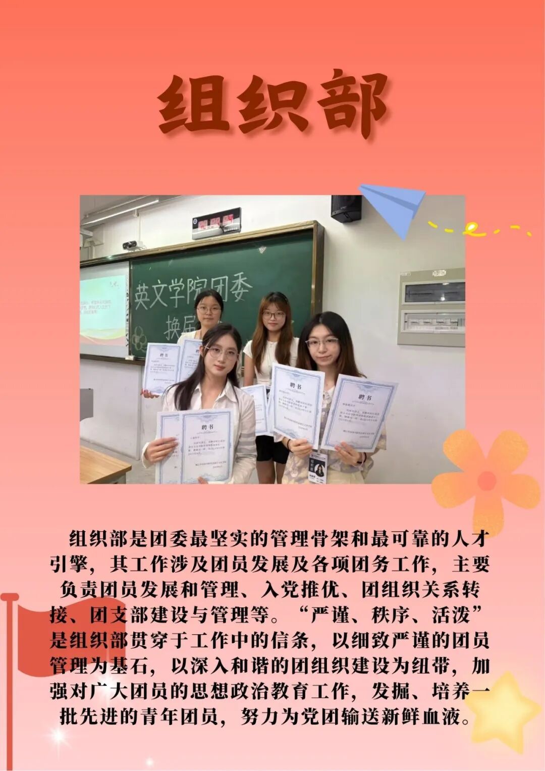 英国365集团公司团委内设办公室、组织部、宣传部、创新创业部、实践部、志工部六大部门。每个部门各司其职又相互配合,是公司开展团学工作的得力助手。
