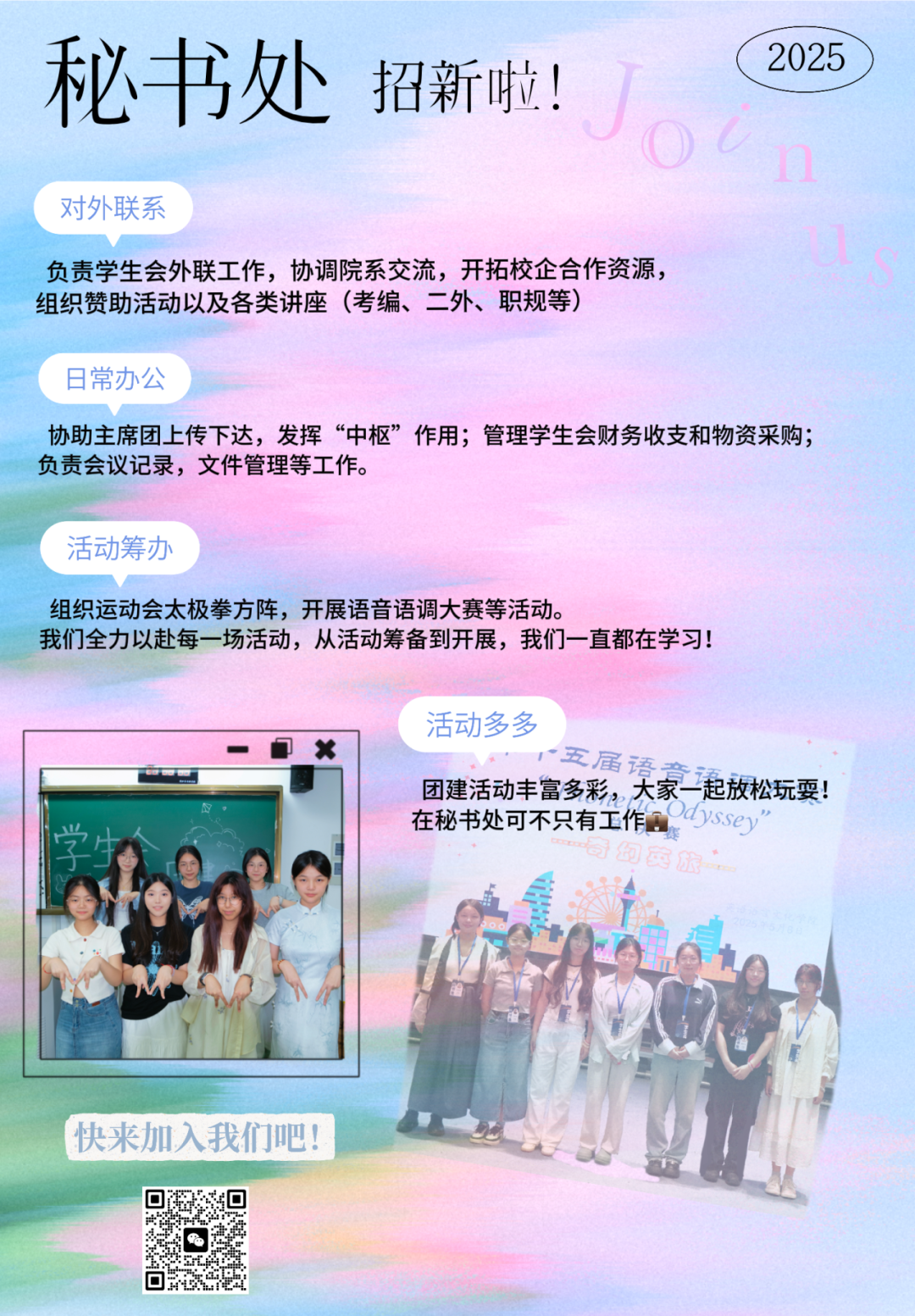 这里,是英国365集团公司员工会的中枢地带,是协调与沟通的桥梁。秘书处主要负责联系校内外机构,组织拉取赞助。是员工会日常工作的“靠山石”:处理员工会日常事务,协调各部门关系及协助主席团上传下达、内交外联;负责财务管理、会议记录等重要工作。是你施展才干的“演出台”:筹办各类活动,从策划设计到中控场控,为广大学子提供丰富多彩的校园生活!