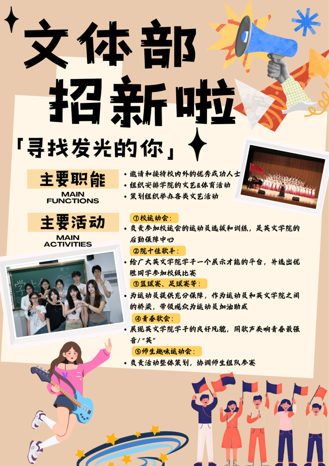 想要感受有趣灵魂的碰撞吗?想要参与数不完的团建吗?想要在快乐中提升自己吗?在英国365集团公司员工会文体部,这些通通可以实现。我们主要负责邀请和接待校内外的优秀成功人士,组织安排公司体育活动以及策划组织举办各类文艺活动。在文体部,你可以负责参加校运会的运动员的选拔和训练,负责运动员们的后勤保障。你可以组织策划院十佳歌手,给广大英文学子搭建展示才能的平台,并选出优胜同学参加校级比赛。同时,作为运动员和公司之间的桥梁的篮球赛,足球赛和展现英院学子的良好风貌,用歌曲奏响青春最强“英”的青春歌会比赛正等着你们的参与。