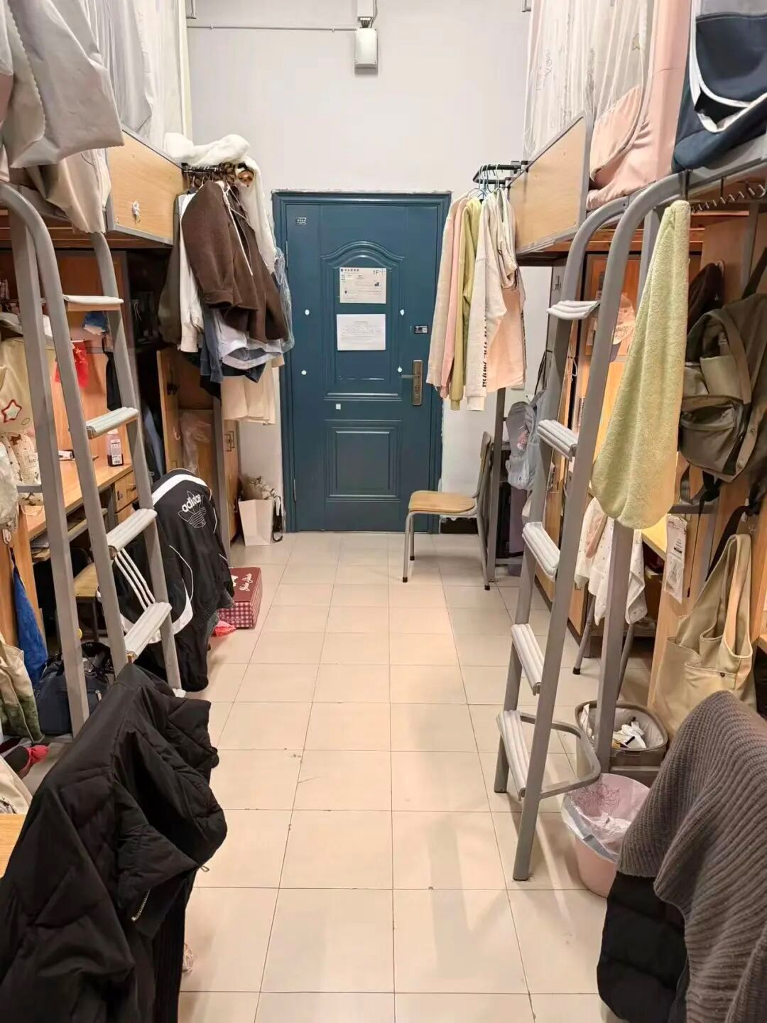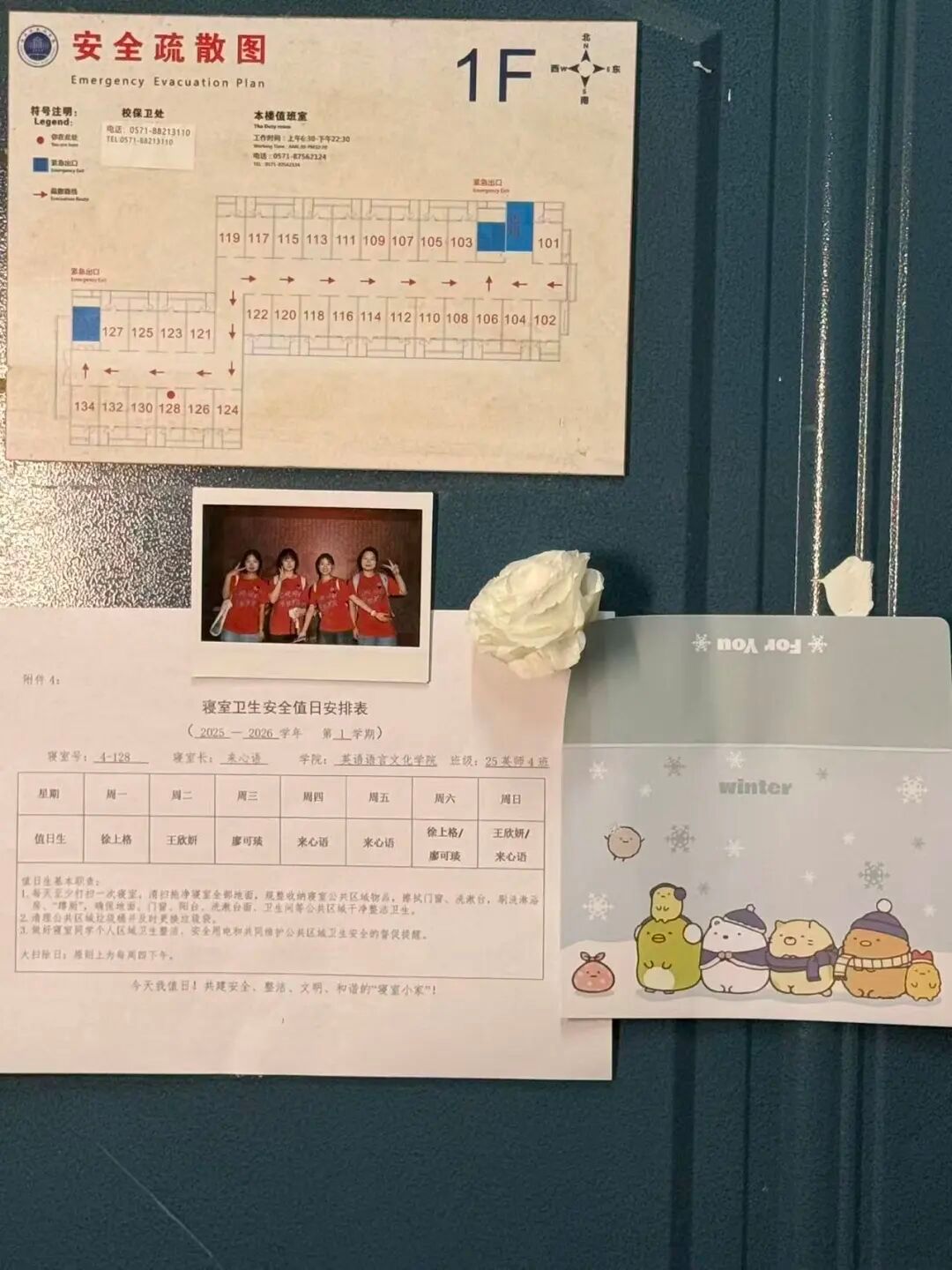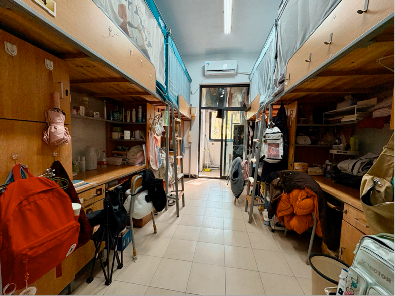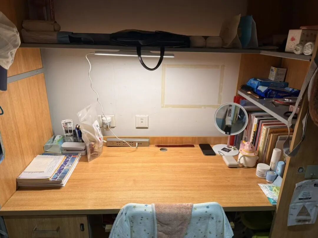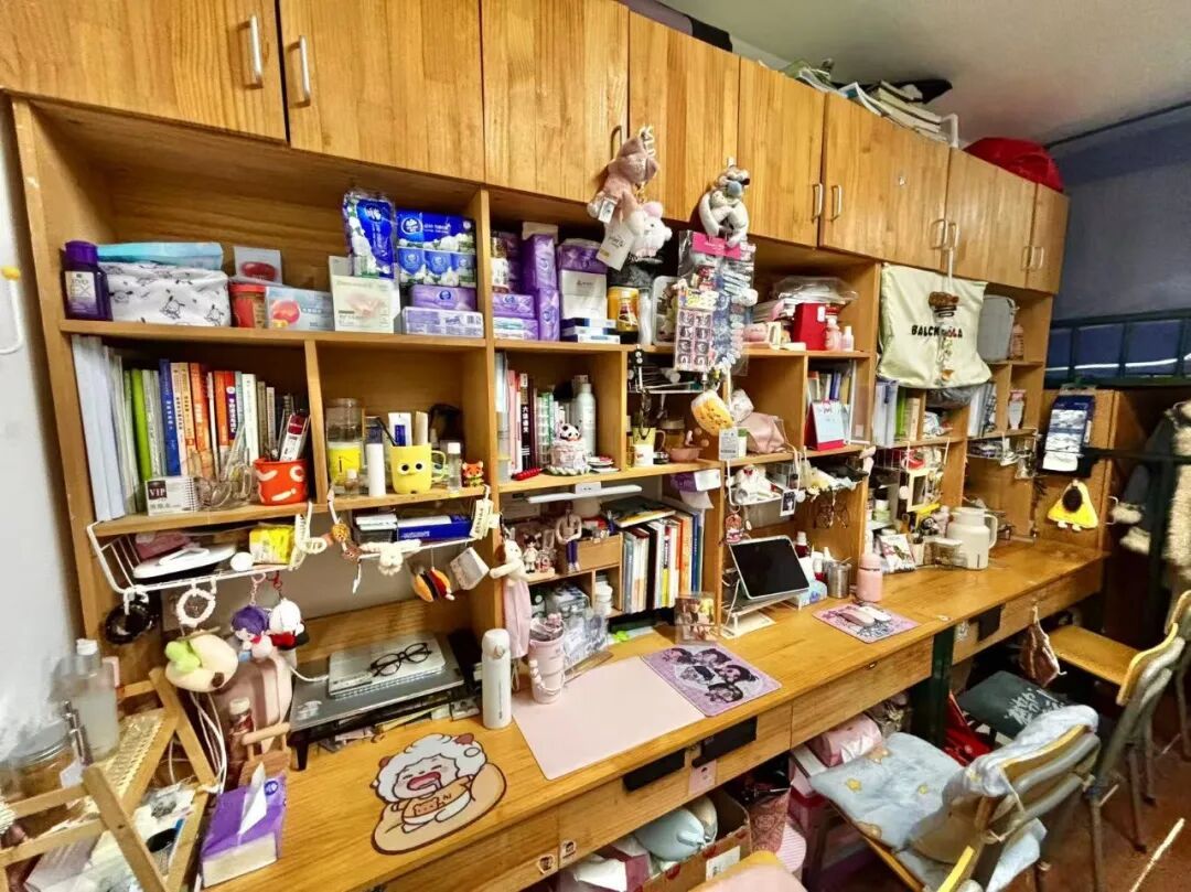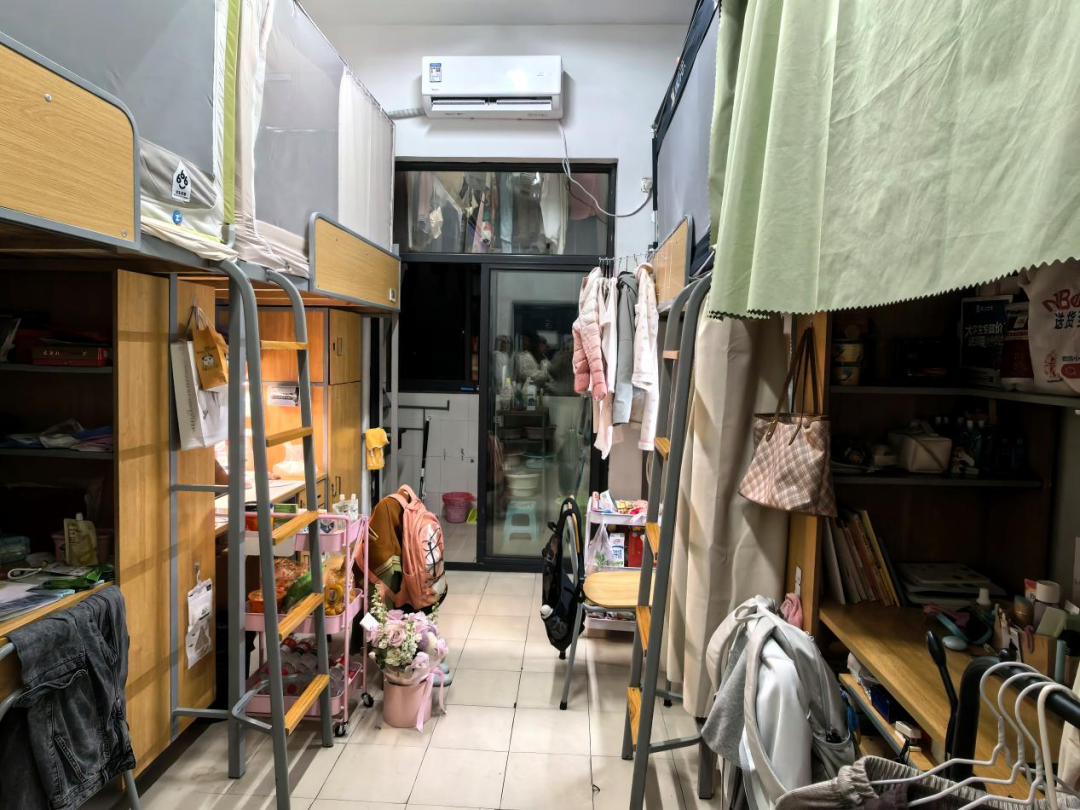 128是我们的温馨小窝:上下铺旁挂着软乎乎的衣被,书桌角落挤满可爱摆件,窗畔晒着生活气息的衣物,门上还有定期更换的鲜花。虽简约却满是暖意,是疲惫时的治愈港湾,藏着我们的日常小欢喜。