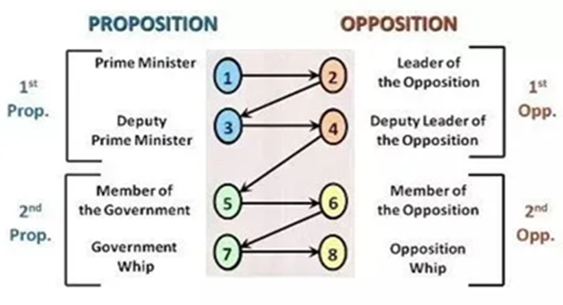 英国议会制辩论——British Parliamentary Style,以下简称BP式辩论。两名选手组成一支队伍,四支队伍同场比赛。四支队伍分别为:正方一队、反方一队、正方二队、反方二队。四支队伍八名选手交替完成7分钟发言。每位选手发言时,除去首末各一分钟,对方选手可任意对发言选手提出质询。
