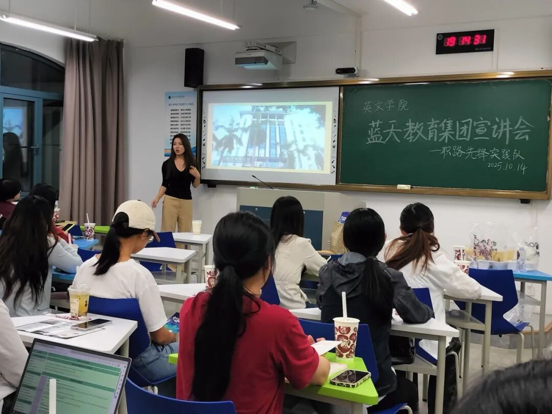 近日,深圳蓝天教育集团2026届校园宣讲会在融院B108顺利举行,深圳市蓝天教育培训公司江浙区英语校招负责人张信紫、张烁及公司20余位员工参与本次活动。